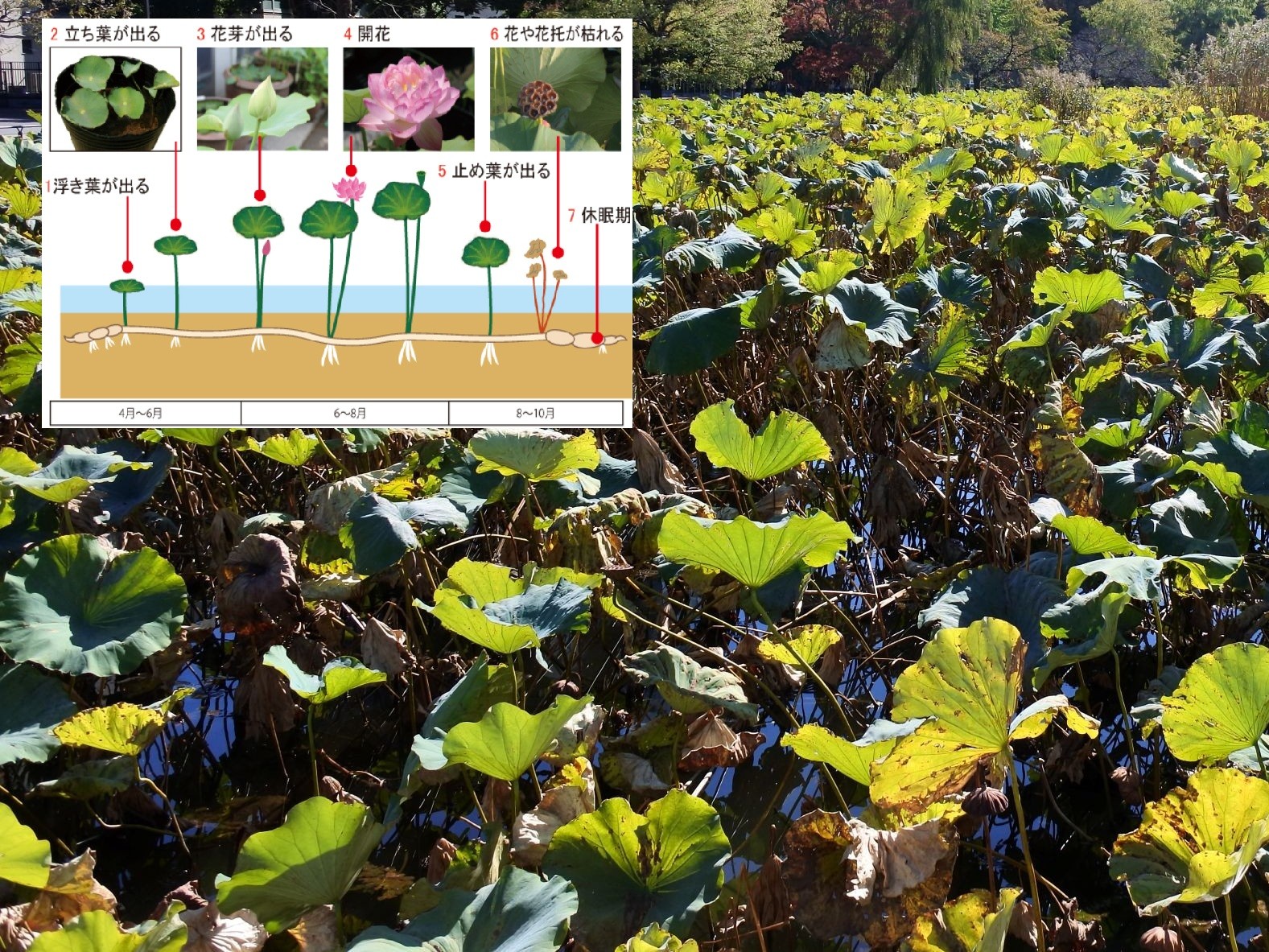葉っぱは大きくなると、それを支えるのが大変、ハスが良い例で大きい。水の上に葉っぱを大きく広げるが、それを支えるに、葉っぱの重心を考えてバランスの良い処から茎が出ている。