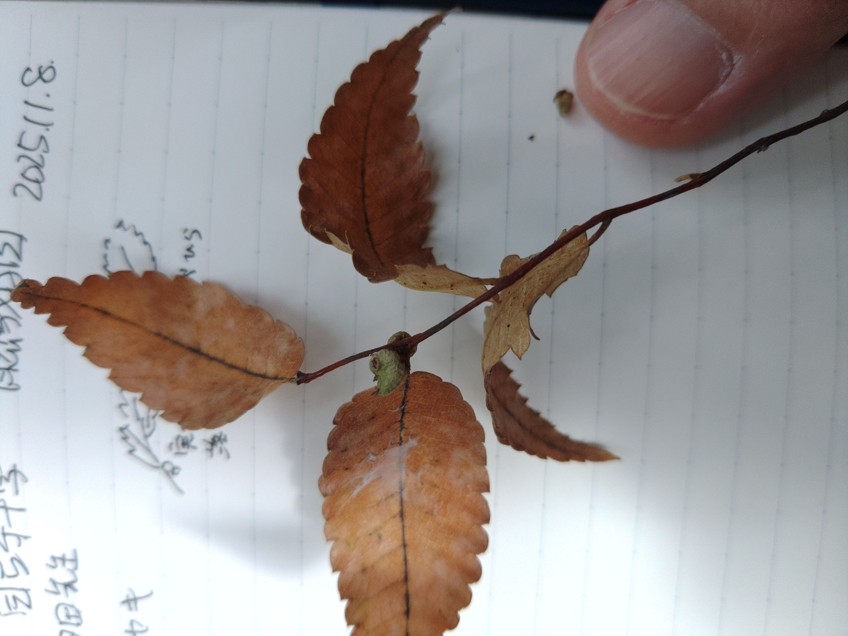 ケヤキの葉っぱが入口にたくさん落ちいた。実は、落葉の方法が興味深い。