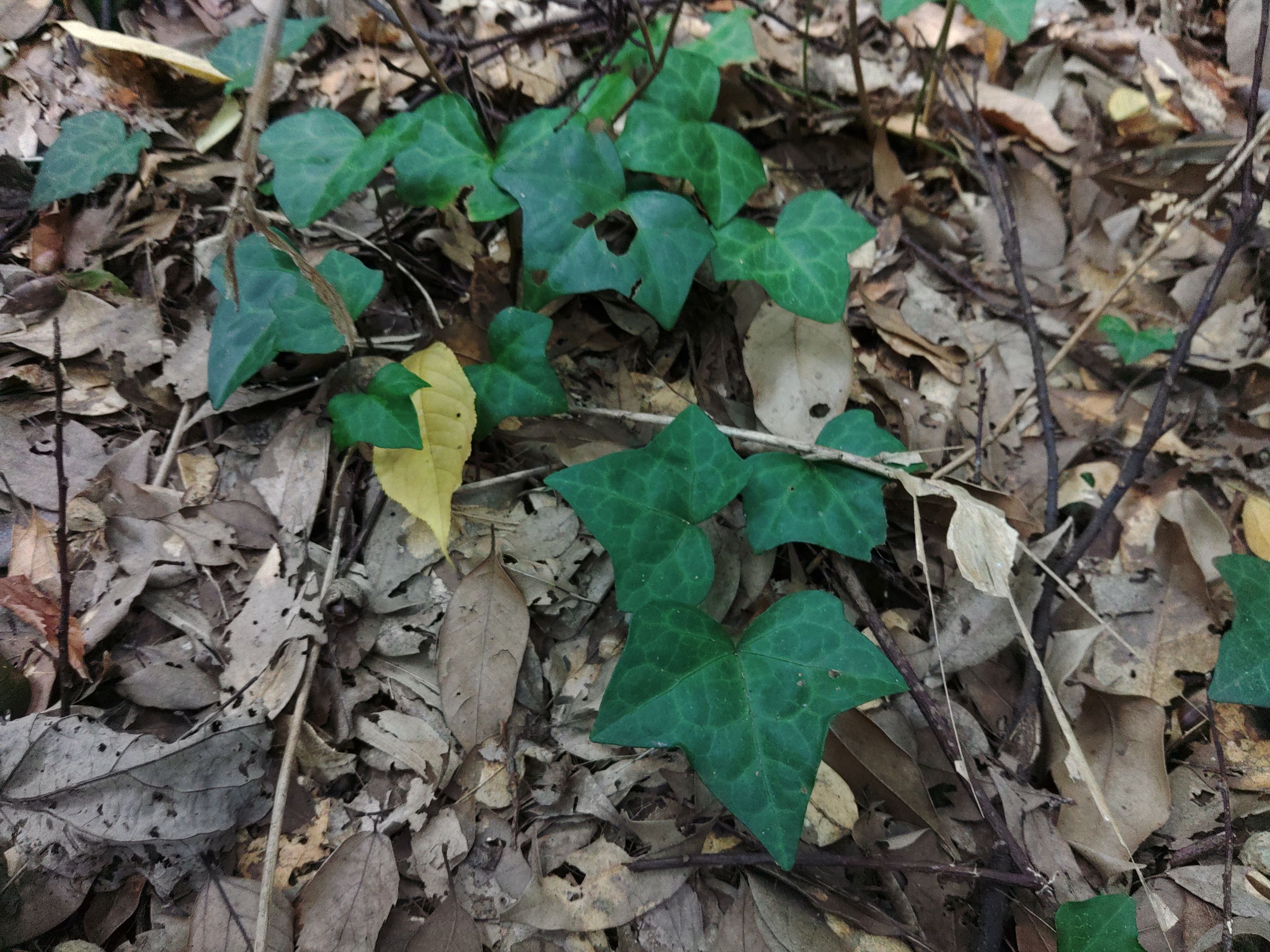 フキも大きな葉っぱが2つついてるが、これもバランスをとる場所に茎が伸びている。写真のキズタは若い頃は浅く裂けて3〜5角に浅く裂ける。この時も、重心を考えているらしい。