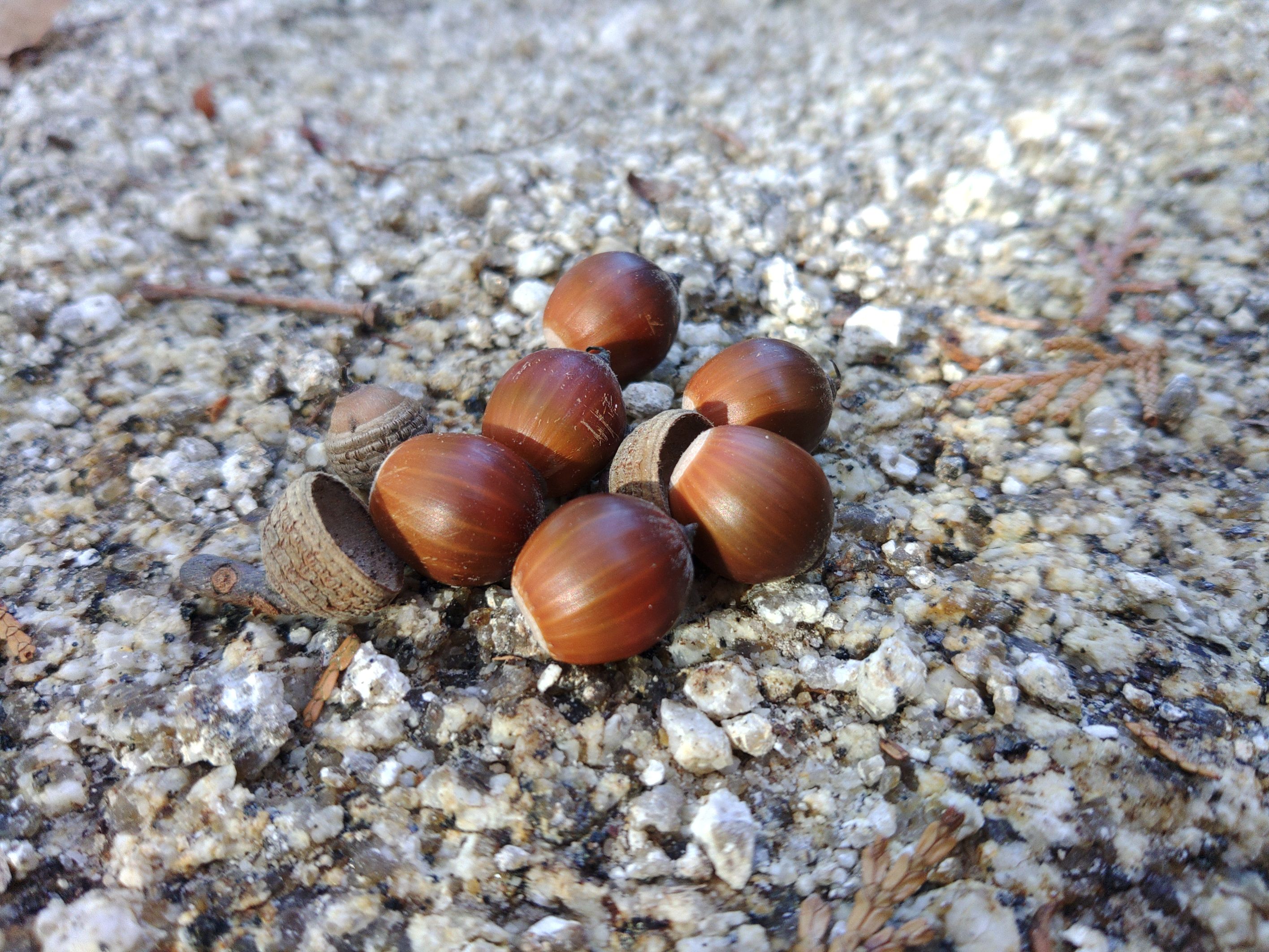 アラカシのドングリ〜アラカシ・シラカシ この丸っこいドングリが可愛いので花崗岩がマサ化したザレ場で撮影〜スマホ撮影