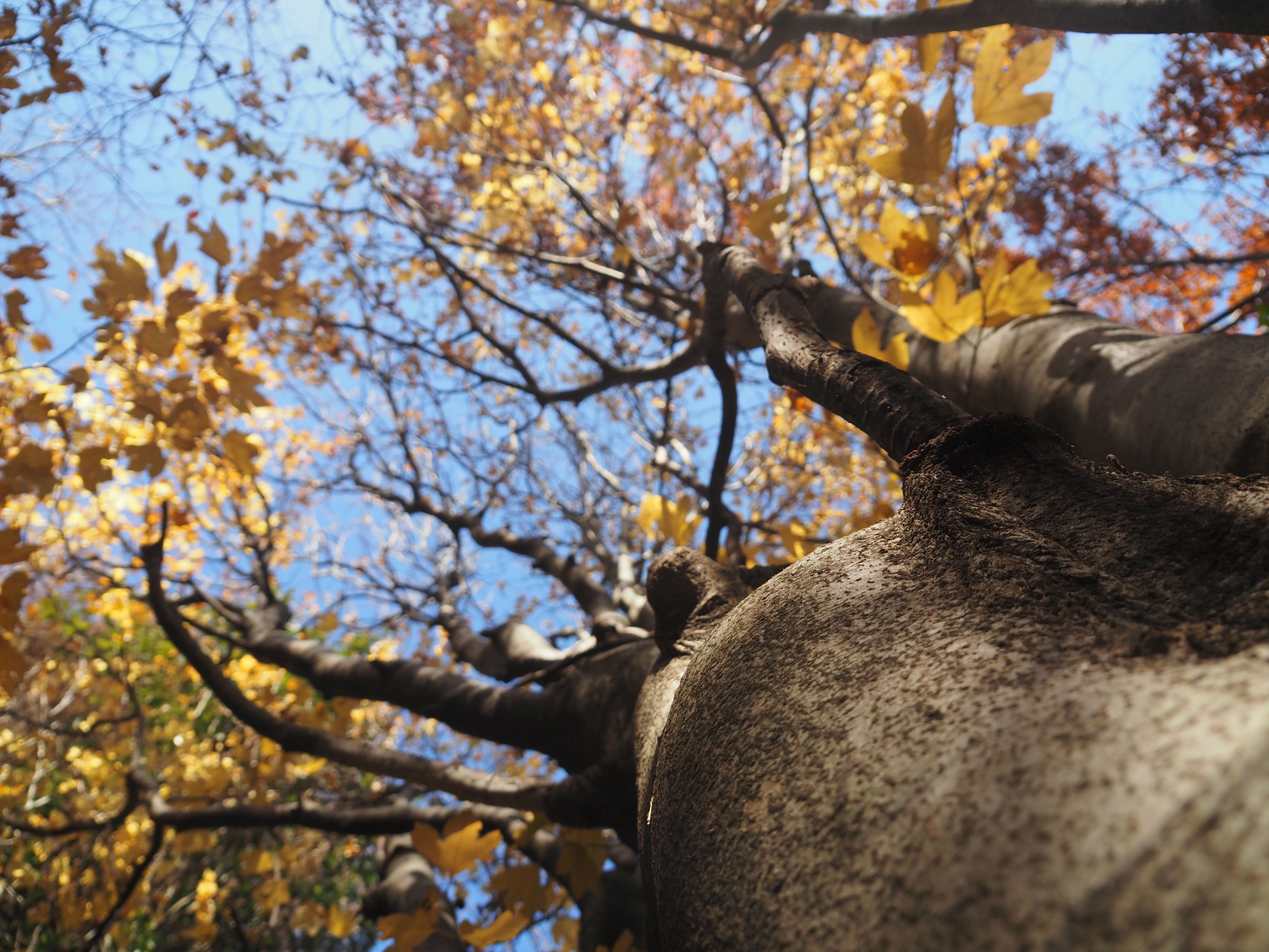タカノツメの黄葉〜なかなか大きな木を見ることが出来た、三出複葉のレモンの黄葉、アラカシの幹がぶっとく印象的