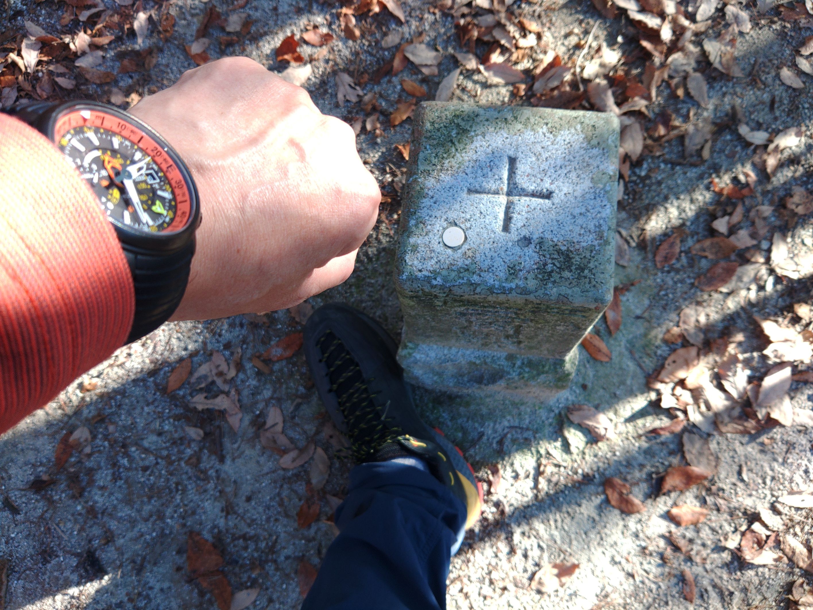 三等三角点〜山頂は展望なし…数m離れたザレ場から展望あるが…元岩巣山からは良き展望〜スマホ撮影