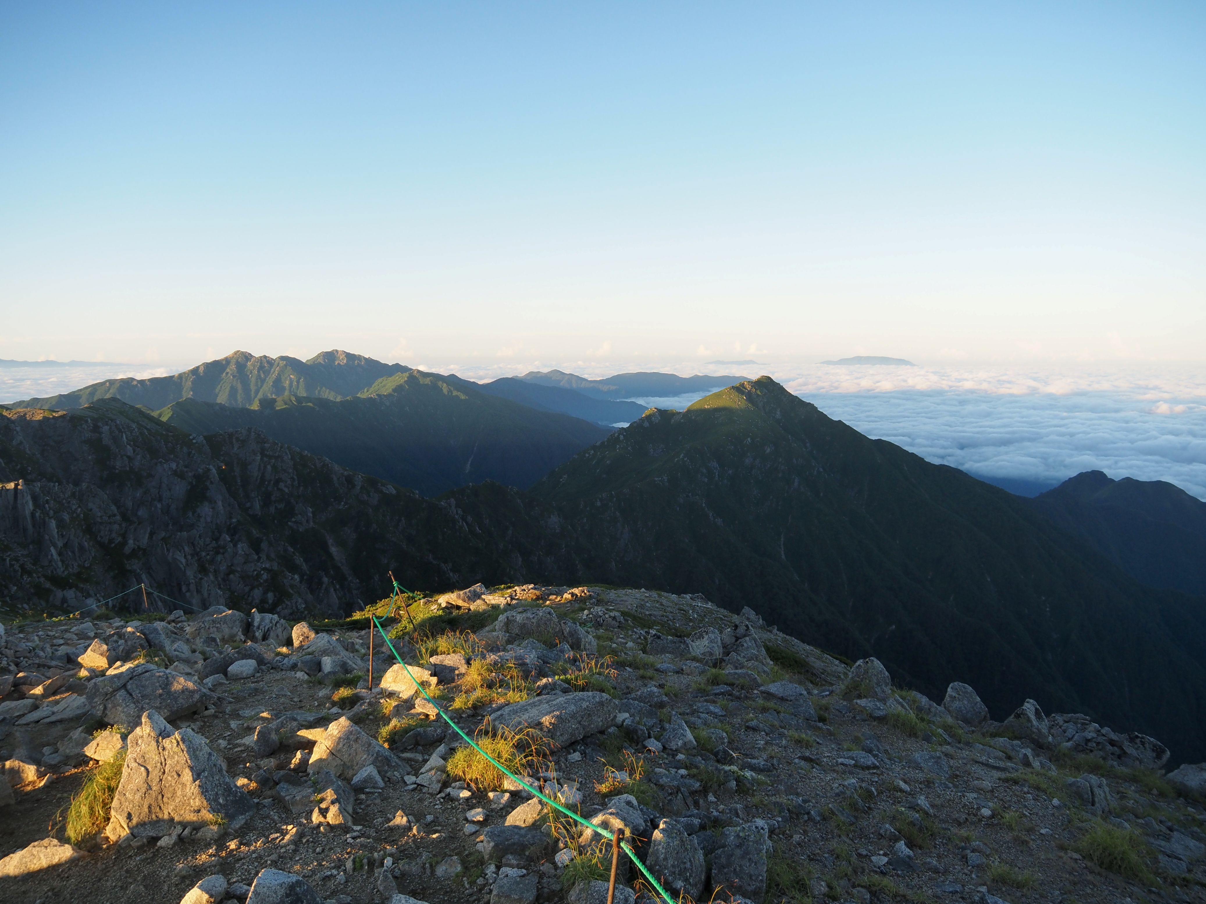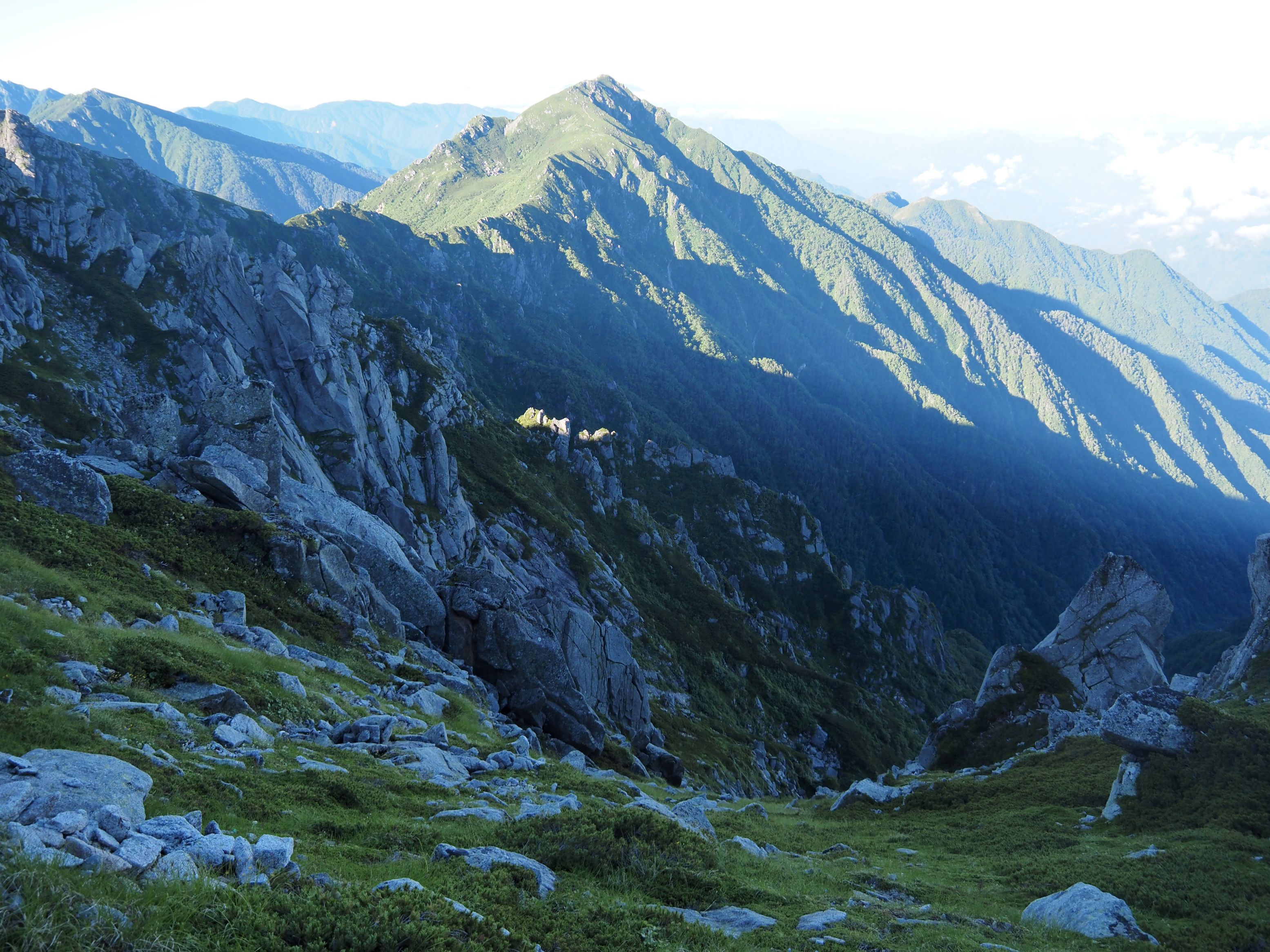 第9位 中岳トラバースから 朝日差し込む三ノ沢岳〜山頂部の明るさとまだ目が覚めない深い花崗岩の谷