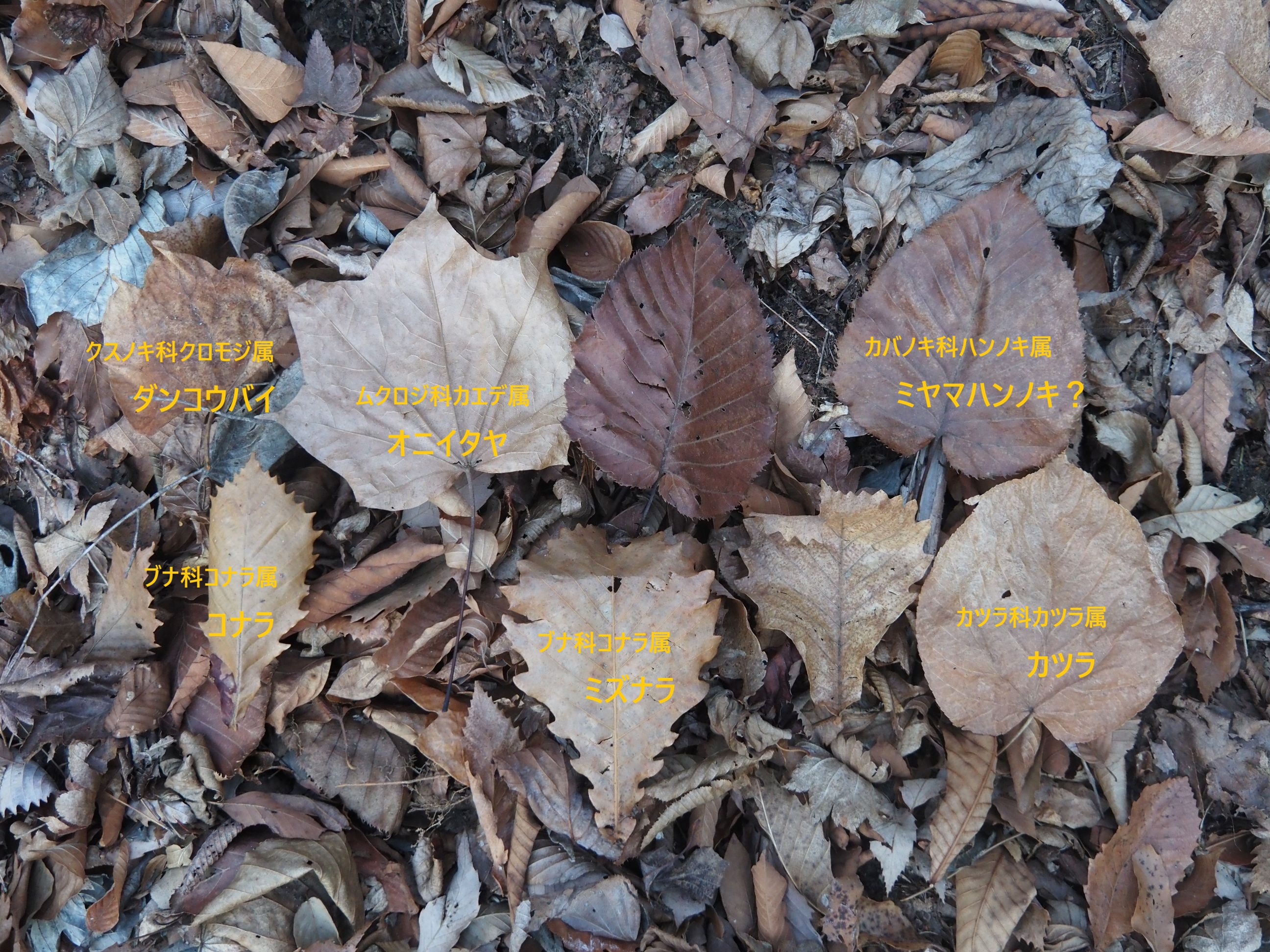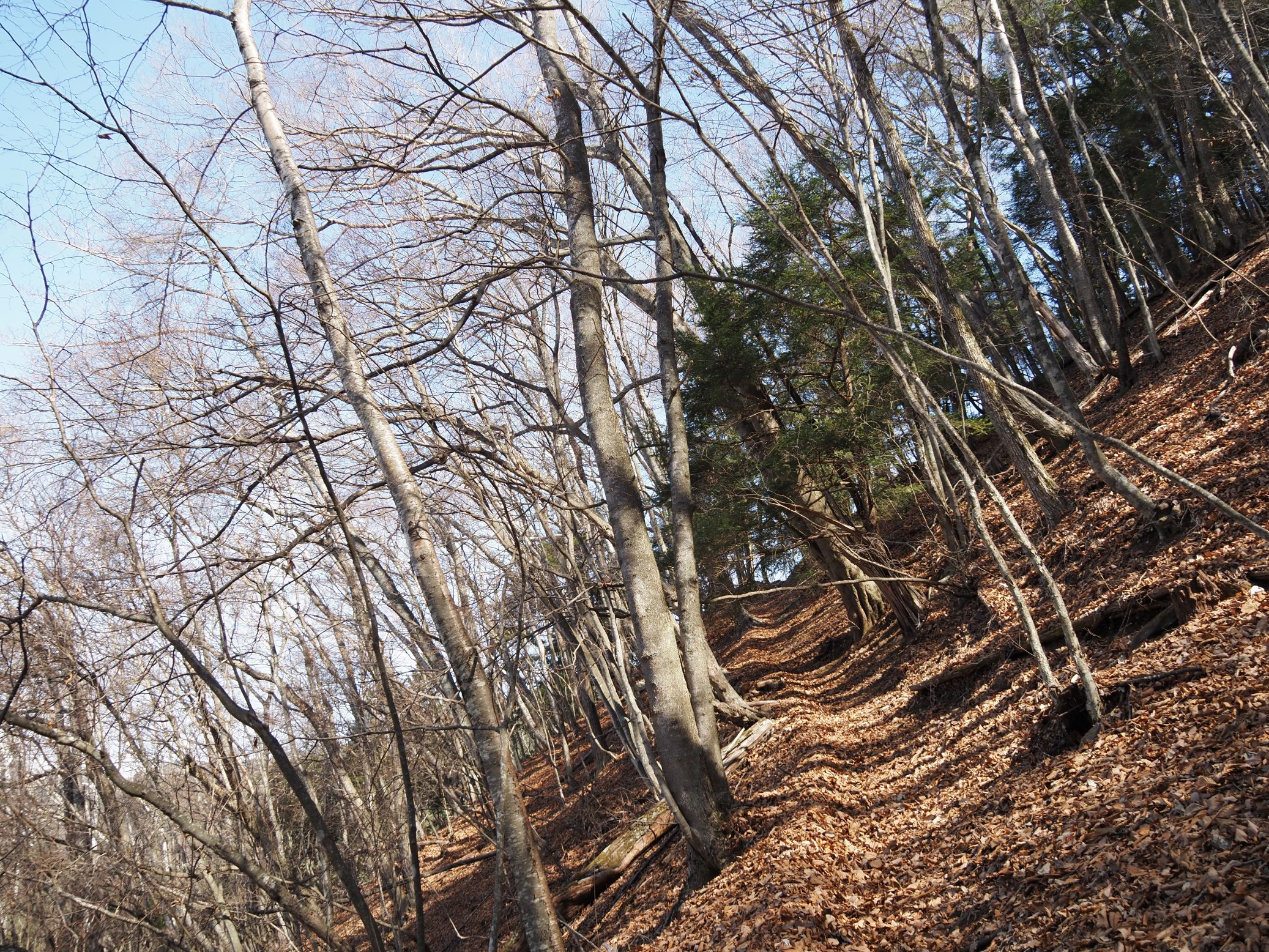 登山道は戸倉キャンプ場からの登山道は落葉広葉樹が多く、冬は登山道が落ち葉で埋まる。どんな樹木があるのか、落ち葉で同定しながら歩く。そんな静かな山歩き。