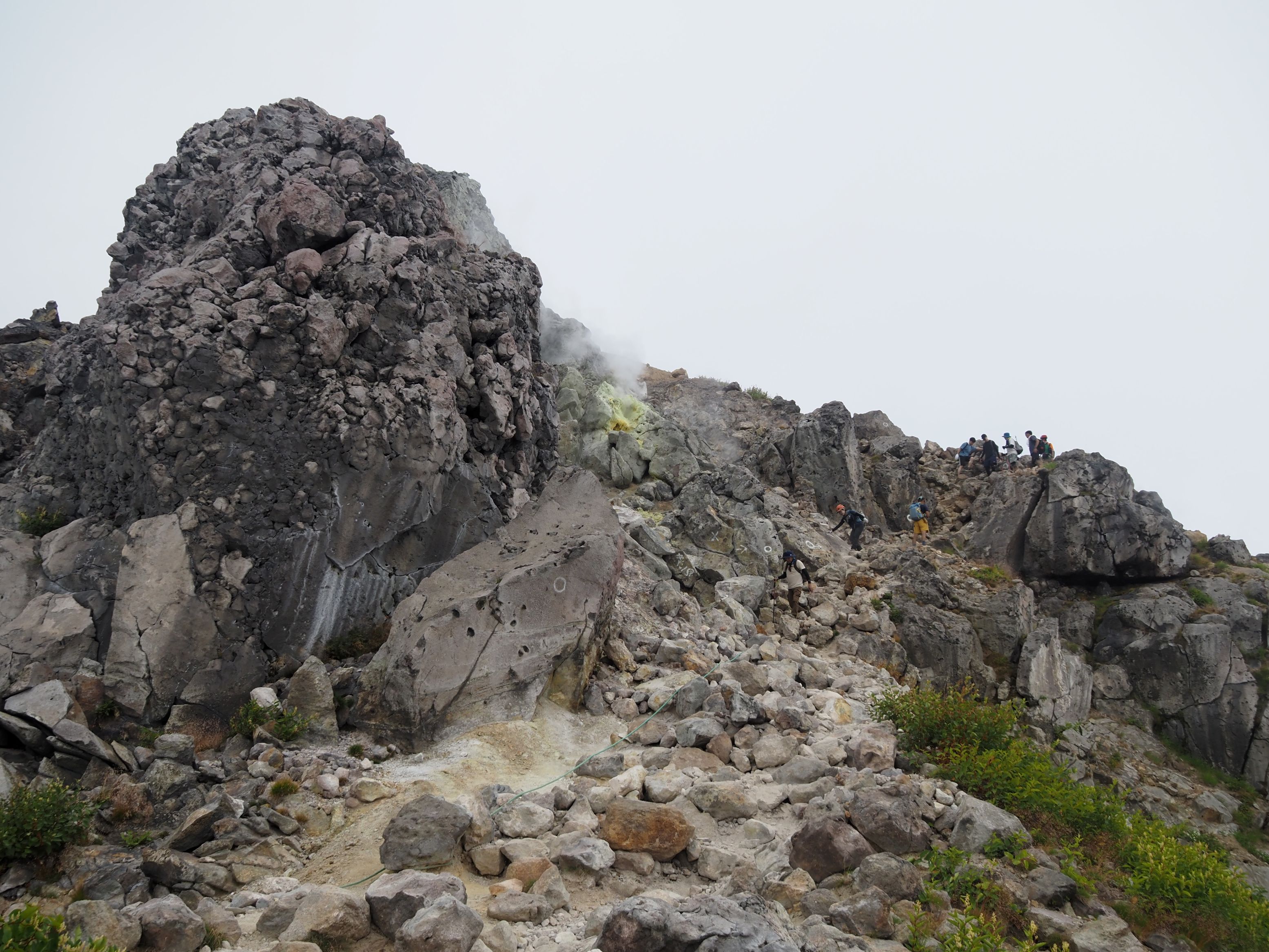 恐る恐る、溶岩ドームの大噴気の直下の道を通り、小さな幾つか噴気孔を横目に見ながら3点支持にて山頂を目指す。